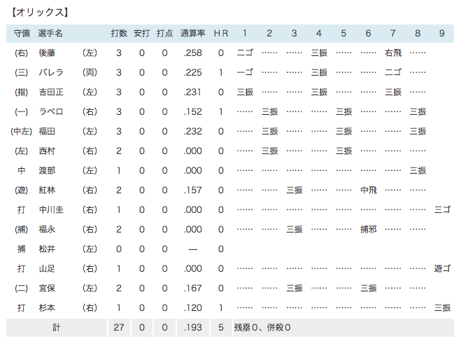 スコアボードと、各打者との対戦成績を見ると、凄いよ。