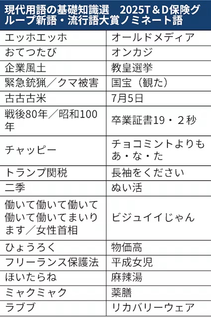 それ以外のトップテンには、「トランプ関税」、「エッホエッホ」、「緊急銃猟/クマ被害」、「国宝(観た)」、「古古古米」、「戦後80年/昭和100年」、「二季」、「ミャクミャク」、「オールドメディア」が選ばれています。