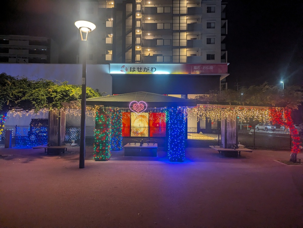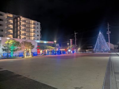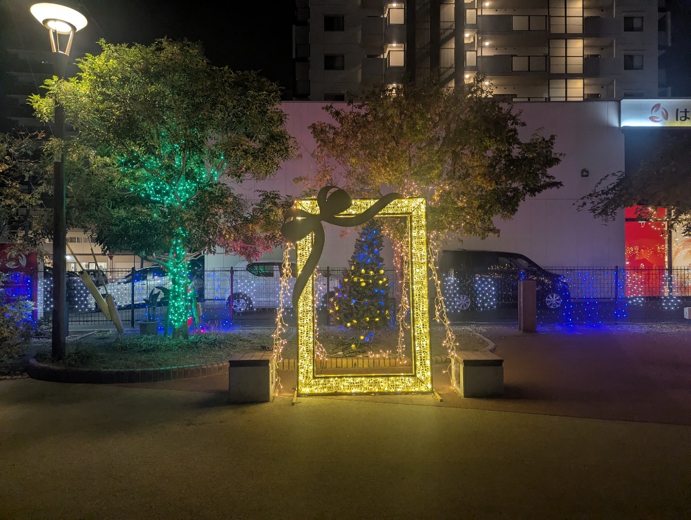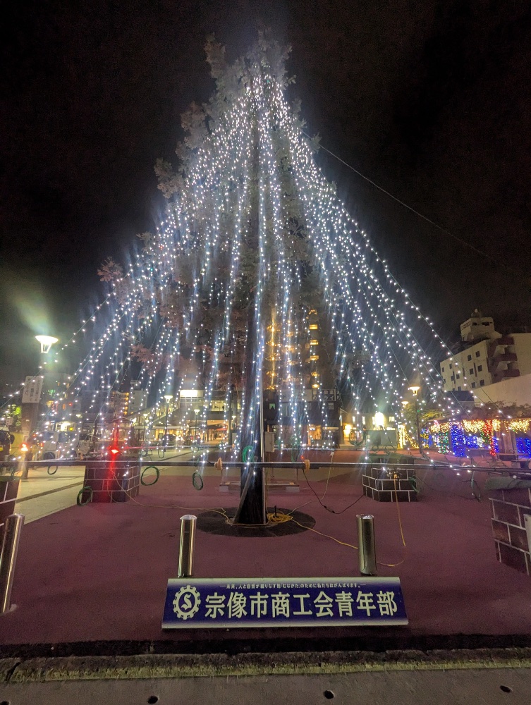 今、赤間駅前の北口側にイルミネーションが設置されててさ。