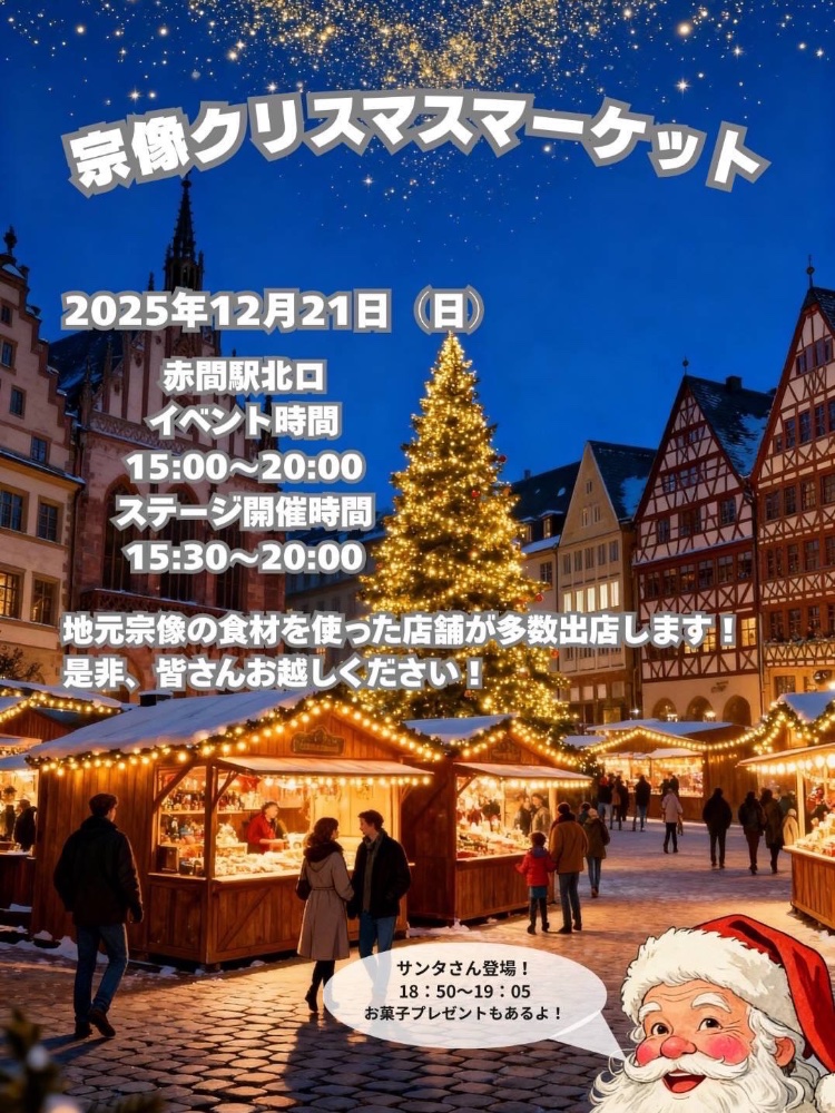 「2025年12月21日(日)」には、赤間駅の北口で「宗像クリスマスマーケット」が開催されるようだ。