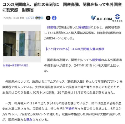 昨年、2025年の民間のコメ輸入量は、2024年と比べて95倍になってたんだって。