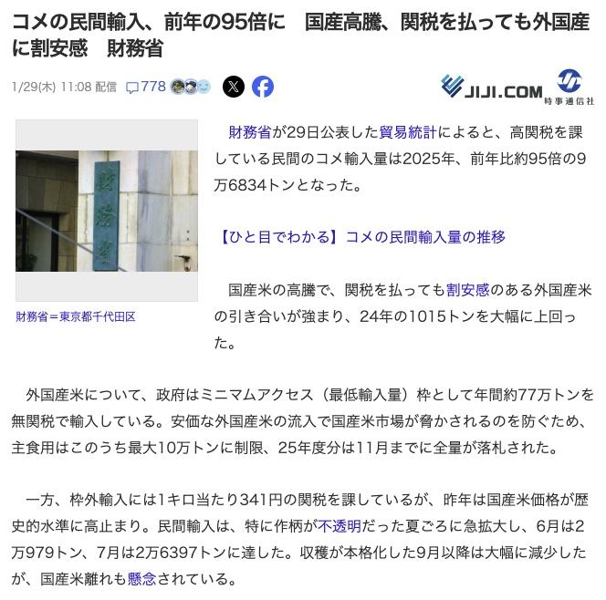 外国産の安価な米が増えることで、国産米市場が混乱しないように1キロあたり「341円」の関税を課しているんだけど、それを払っても輸入米が安いってことだよな。
