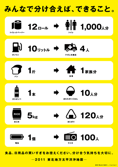 そんな中、被災地以外での物の買い控えをする動きが活発化しているようです。少しでも被災地に物資を、、、という気持ちの現れでしょうか。「twitter」を中心に下記の画像が出回っているようです。当ブログでも取り上げておきます。