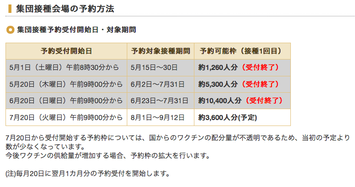 「7月20日から受付開始する予約枠については、国からのワクチンの配分量が不透明であるため、当初の予定より数が少なくなっています。」という表記です。